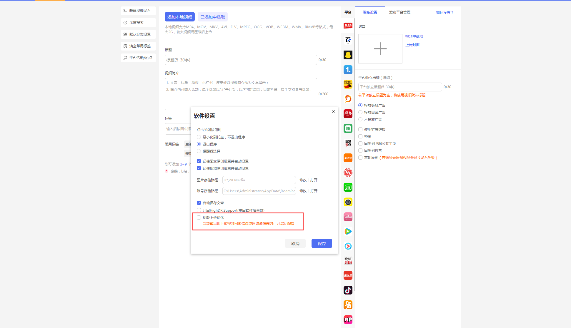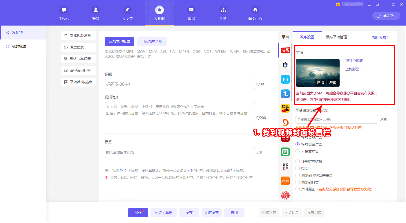 瑙e喅鏂規(guī)硶濡備笅錛氬湪銆愯棰戝彂甯冦戠晫闈腑鍙充晶銆愬鉤鍙拌緗戦」涓壘鍒般愬皝闈㈣緗戞爮錛屾牴鎹彁紺虹偣鍑匯愬帇緙┿戞寜閽紝鍘嬬緝銆愬皝闈㈠浘鐗囥戣嚦銆?M浠ヤ笅銆戝嵆鍙紱