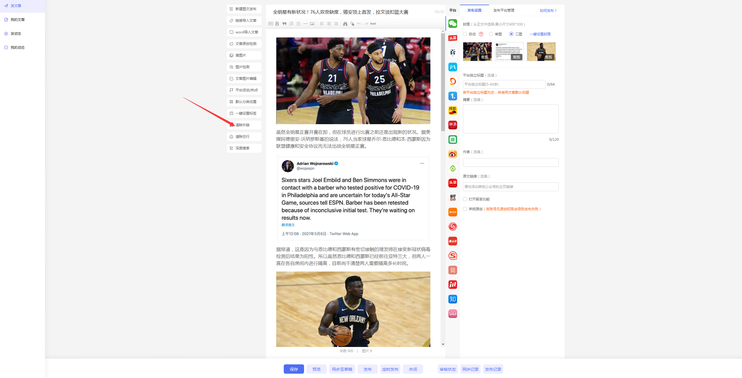 澶存潯鏂囩珷鍙戝竷鍐呭涓笉鍏佽娣誨姞鍏跺畠騫沖彴閾炬帴錛屾?zhèn)ㄥ彲浠ラ氳繃鍔╂墜鐨勬竻闄ゅ閾懼姛鑳芥潵鍒犻櫎錛岃涓嬪浘,娓呴櫎鎴愬姛鍚庣偣鍑?yán)L枃绔犱繚瀛樻寜閽紝鐒跺悗鍒板悓姝ヤ腑蹇?jī)閲嶈瘯鍗冲彲銆?